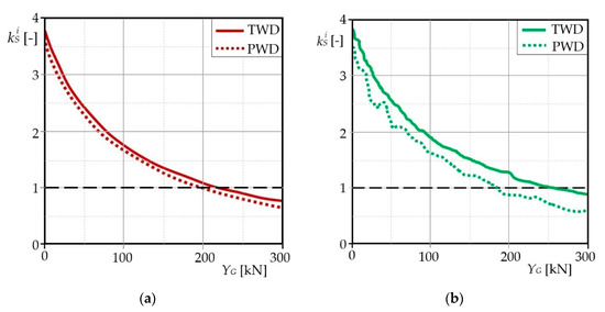 The results of calculating values of the coefficient for the wheels of both designs (TKS as well as PKS) depending on the value of the guiding force Y in the flange contact are shown in Figure 4. These results are calculated for the chosen parameters as following: Q = 125 kN, ψ = 0.015 rad and KW = 1.021.