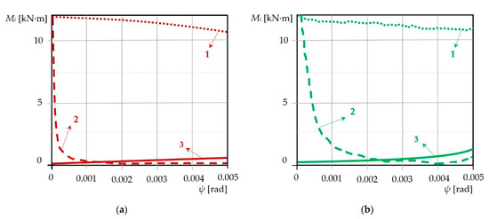 Figure 6 and Figure 7 show the results of the calculated values of the corresponding moments performed for both considered designs of wheels with the following chosen initial conditions: Q = 125 kN, YG = 50 kN, KW = 1.021, μr = 0.25, rW = 0.475 m, hF = 0.01 m.