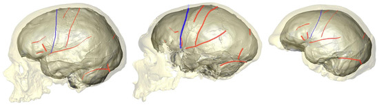 Comparison between the position of the main sulci of the endocranial surface (in red) and the shape and position of the skull, including the course of the coronal suture (in blue) in Cro-Magnon 1, an Upper Paleolithic Homo sapiens; La Chapelle-aux-Saints 1, an Homo neanderthalensis; and Sambungmacan 3, an Homo erectus.