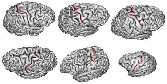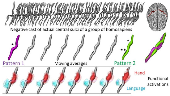 Another limitation is that the methodologies employed in most previous studies of cerebral or endocranial asymmetries involved qualitative assessment or a simple index of bilateral traits and did not analyze departures from symmetry and different patterns of asymmetry (i.e., fluctuating and directional asymmetry, antisymmetry) in efficient and adapted ways [61]. It has indeed been shown that the brains of extant hominids demonstrated high levels of fluctuating asymmetry, allowing pronounced developmental plasticity and therefore making brains highly evolvable [62]. The quantification and analysis of the morphology—including the asymmetries—of the endocranial cavity need further development. Currently, the most advanced computational tools used in analysis of bilateral shape asymmetries rely on the standard framework of landmark-based morphometrics [63,64]. In this context, in addition to homologous landmarks between shapes for population studies, one must define homologous landmarks between the two sides of each shape under study. Analyses can then be carried out by using slight modifications of the linear distance-based [65] or superimposition [66,67,68,69] methods. However, we identified methodological problems underlying the theory and its application to the assessment of bilateral asymmetries [48,70,71]. Moreover, a limited set of landmarks is likely to be inadequate to capture the shape of intricate anatomical structures, or that of structures with few obvious salient features, such as brain endocasts. New methodological improvements are therefore necessary to better characterize and quantify bilateral asymmetries [72,73]. A specific methodology has been developed and tested on the endocast of the Cro-Magnon 1 fossil [28]. This approach is promising as it allows for an independent characterization of the asymmetries without referring to the potential global asymmetry of the object that is analyzed. New approaches based on machine learning could also be a source of inspiration. They allow us, for example, to establish the asymmetry of folding patterns without requiring the definition of homologous landmarks across subjects and hemispheres. For instance, the double-knob configuration of the central sulcus, depicted in Figure 6, is more frequent in the left hemisphere [74]. These new approaches could contribute to the old question of the language-related asymmetry of the third frontal convolution, which is difficult to tackle because of the large intraspecies variability of the related folding patterns [75].