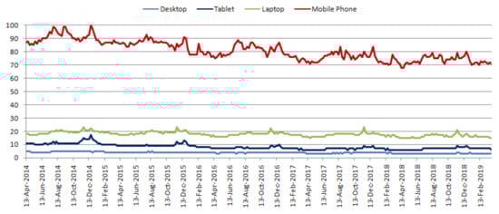 The smartphone sector has risen tremendously in the mobile phone application industry as a result of recent developments in science and technology [1,2]. Because of their many capabilities, which include data storage and processing, these devices are often regarded as one of the most important Internet-of-Things (IoT) devices [3]. To put it another way, today’s smartphones are also known as “next generation multi-functional mobile phones” (i.e., “powerful cell phones” and “wireless-enabled PDAs”) since they allow data processing and better wireless connection [4]. We demonstrated in an earlier paper [5], that users’ interest in “mobile phones” is increasing at a faster rate than that of other platforms, such as “desktop computers”, “laptop computers”, and “tablet computers”, according to Google Trends data [6] and that this interest is increasing on a daily basis, as illustrated in Figure 1.