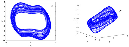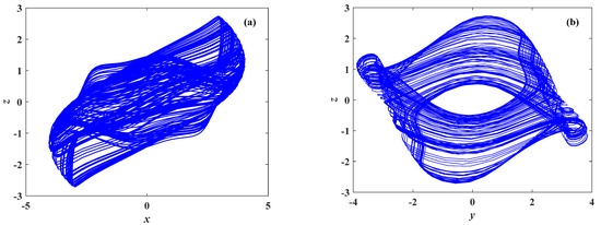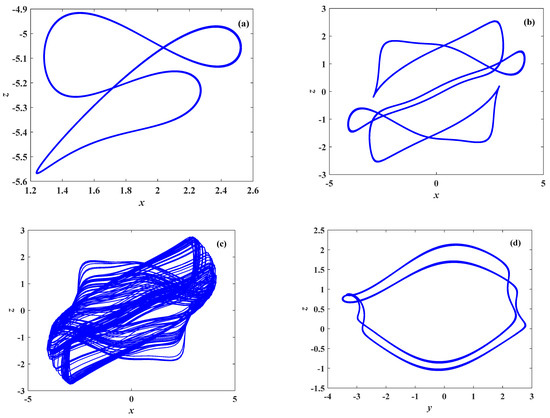 To reveal the dynamics further, phase portraits of system (8) on the x-z plane with a = 0.4, a = 1.5, a = 2.3 and a = 2.8 are plotted in Figure 5a–d, respectively. These figures illustrate that the system is periodic at a = 0.4, a = 1.5 and a = 2.8, while it is chaotic at a = 2.3. In this case, from the observation that a decreases gradually, the system enters chaos through period-doubling bifurcation.