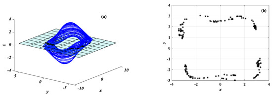Poincaré diagrams are one of the most important tools for analyzing chaotic dynamic systems; they are applied to fractional chaotic systems to judge whether they are chaotic by observing the distribution of cut-off points. When the Poincaré diagram is filled with dense points with a fractal structure, the motion is chaotic. In this model, we take the plane z = 0, obtain the corresponding Poincaré diagrams, as shown in Figure 2, and judge system (9) to be a chaotic system.