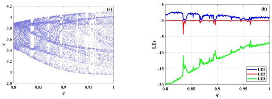 Let a = 2, b = 10, c = 3, h = 18, derivative order q vary 0.8 to 1, and the initial values of state variables [x0, y0, z0] = [1, 1, 0.1]. Figure 3a shows the bifurcation diagram and Lyapunov exponent spectrum with changes in system parameter q. It can be seen from the figure that under the change of derivative order q, when the bifurcation diagram of the system is in a chaotic state, the maximum Lyapunov exponent of the system is positive, and chaos and period appear when the system repeats and crosses, which is not a direct process from period to chaos. More importantly, the maximum Lyapunov exponent of the system decreases with an increase in derivative order q, and the maximum Lyapunov exponent of the system is the lowest when q = 0.81. Therefore, it is of great significance to study fractional order systems.