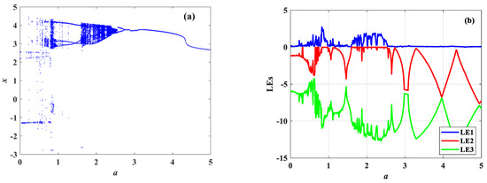 Dynamics of the system with a varying. (a) Bifurcation diagrams and (b) Lyapunov exponents.