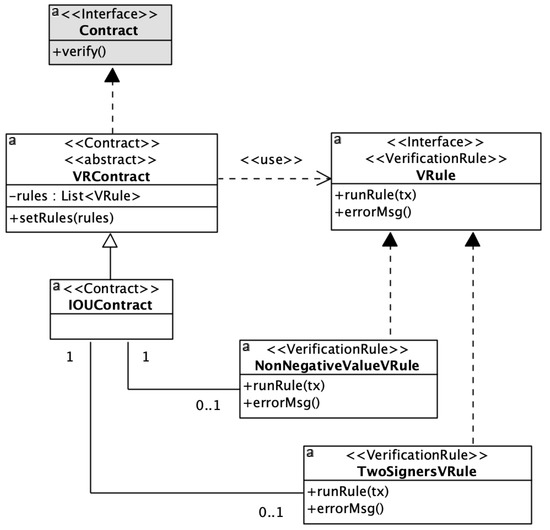 smart contract design pattern with the complete set of interfaces and classes. For readability, the figure shows only two concrete verification rules.