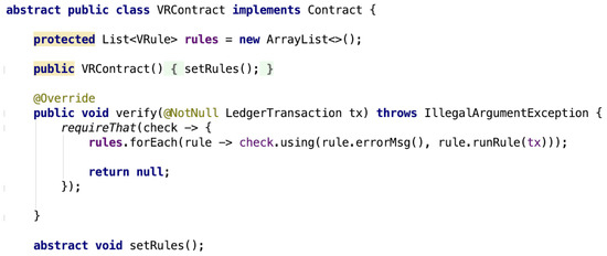 All of them have been used to propose the smart contract design pattern for the R3 Corda distributed ledger framework. That pattern allows the design of smart contracts in a flexible manner with the application of a dynamic list with verification rules. The pattern uses the Contract interface from the Corda framework. By default, the concrete class implements the interface. The verify() method is declared in the interface. In the method, the concrete class implements the rules that verify the contract. However, it is embedded in the body of the method and any change to the rules requires recompilation. In the proposed approach, we have a list of verification rules in the method. The verify() method will work correctly regardless of how many and what rules we introduce in the list of rules. In the case of extending the rules, we add the appropriate class for a new verification rule.