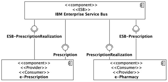 PrescriptionRealization service. The component with the ≪ESB≫ stereotype manages communication between those two applications.