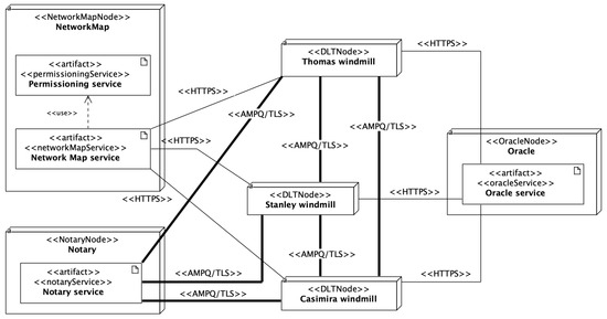 The profile concentrates on the platform-specific model (PSM) to express the precise deployment configuration of the R3 Corda framework. The profile has been configured in such an elastic way that it encompasses Corda’s versions from 4.3 to 4.6. Stereotypes have been applied for nodes, services, and communication protocols. The network map node hosts the network map service. Notary’s node responsibility is signing transactions. Oracle node provides facts from the outside world that are needed to commit transactions. The DLT node can transact with other nodes. The Corda node is an abstract one. That abstract node is needed to hold properties that are shared among all nodes. Nodes in the Corda network communicate using protocols through transactions. Nodes host and run services. The permissioning service provides TLS certificates. The network map service enforces rules allowing nodes admission to the network. The notary service signs transactions providing proper timing. Two additional stereotypes have been added for communication protocols: HTTPS, and AMPQ/TLS.