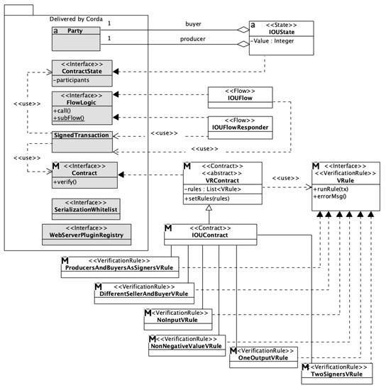 Figure 14). Elements from the Corda environment have a gray background, and classes and interfaces that should be implemented are presented in white.