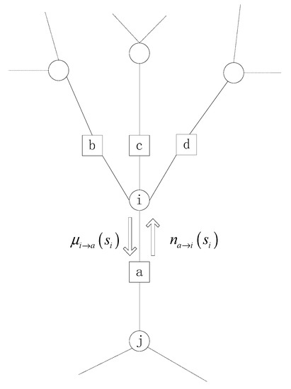 As shown in Figure 1, two types of information are defined on the edge of the factor graph, namely the information () transmitted by the argument to the clause and the information sent by the clause to the argument [19,20]. indicates whether the argument is in or not, the probability that the value is under the constraint of clause , and the probability that the variable takes the value of without the constraint of clause . represents the probability that the variable takes the value of to satisfy clause . According to the cavity theory in statistical physics, the following BP iterative equation can be obtained [21]: