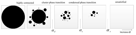 Take the change of solution space of k-SAT formula as an example, as shown in Figure 2. When the constraint density gradually increases from zero and is close to , although the solution space has only one macroscopic state under the meaning of statistical significance, more and more community structures and more and more community structures have been accumulated in this macroscopic state. Strong point-to-set association. The point-to-collection feature correlation length tends to be infinite as becomes smaller. In the random k-SAT problem, when exceeds until it reaches another critical value point , the solution space of the random k-CNF formula will be condensed. Regarding [22], it signifies that the statistical properties of the solution space begin to be determined by those subspaces that contain the largest number of microscopic configurations but a small number. In the random 3-SAT problem, , that is, the cluster phase transition point and the condensed phase transition point coincide. When , the number of subspaces that determine the statistical properties of the solution space changes from the order of to the order of (where and are constants).