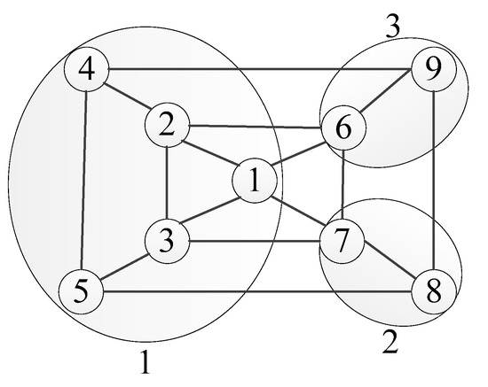 The nodes in Figure 3 are divided into three communities, namely {1,2,3,4,5}, {7,8}, {6,9}. The division of the community structure not only depends on the inherent relationship between nodes and more importantly, divide the nodes with similar influence distribution of the frozen variables on the solution community into the same community, and always follows the principle of minimizing structural entropy in the process of radiating other nodes. Therefore, the community structure can be maximized. It satisfies the information minimization principle in the definition of structural entropy, that is, it satisfies in the definition of two-dimensional structure entropy and in the definition of K-dimensional structure entropy.