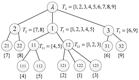 After initializing the split tree, the undirected graph is divided into communities to obtain multiple overlapping communities , and these overlapping communities are used as the second-level nodes of the split tree, where the parent nodes are the root nodes (including all nodes in the undirected graph). Each community contains one or more nodes, and . If the number of nodes in () is greater than one, continue to divide , and use the sub-community as its child nodes. If the sub-community still contains multiple nodes, repeat the above steps to continue dividing the community until it is in the community. When only a single node is included, the division of the community is stopped.