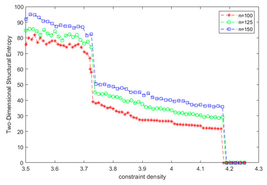 The hardware environment for the experiment is Intel Core i7 9750H + RTX 2060 + 16 GB RAM, and the software environment is Windows 10 64 + ubuntu18.04 + xshell + Python3.7 + Matlab. Let us use the model to generate the 3-SAT formula, where is the number of arguments and is the number of clauses. We let , then generate a CNF formula with a length of 100, 125, 150, and increase the value of the constraint density by adding randomly generated clauses one by one. In the solution space undirected graph, Algorithm 2 is used to divide the communities, and the two-dimensional structural entropy of the solution space of the 3-SAT formula is calculated. The result is as follows: