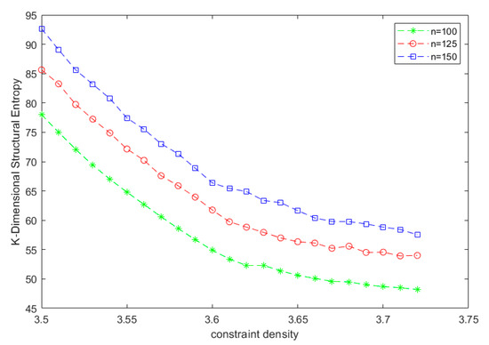 Before the clustering phase transition occurs, each solution cluster in the solution space is relatively large, and the number of solutions has not decreased sharply. It contains complex community structures and rich multidimensional communities. The entropy of the two-dimensional structure cannot be accurately determined. The solution space structure is measured, that is, the decrease in the entropy of the two-dimensional structure shown in Figure 7 is unstable. Therefore, this section uses the k-dimensional structural entropy to measure the k-dimensional structural information of a single decluster of the solution space. The solution space undirected graph data constructed in the process of calculating the entropy of the two-dimensional structure are used continuously, and Algorithm 2 is used to iteratively partition the community, divide the partition tree, and then calculate the k-dimensional structure entropy. The result is shown in Figure 8.