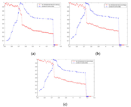 Changes in the Number of Communities and Two-Dimensional Structure Entropy. (a) n = 100 (b) n = 125 (c) n = 150.