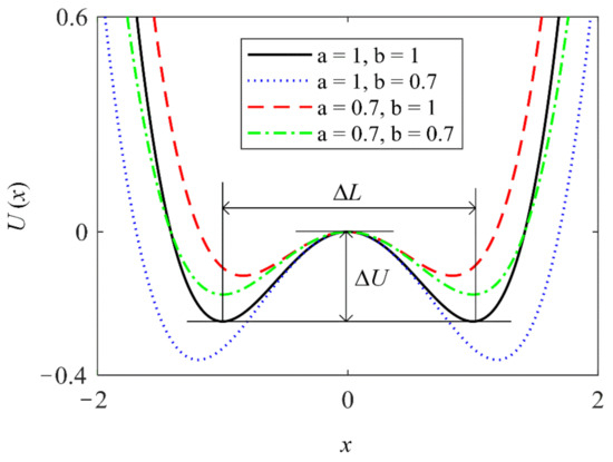 where and are the barrier parameters of the bistable potential model with positive real values. Figure 1 illustrates the shape changes of bistable potential under varying system parameters. It is seen that, for the traditional SR system with the bistable potential model, only two parameters can be adjusted. When the system parameter, or , is changed, the width and height of the potential barrier will change simultaneously, which indicates that the model cannot achieve an independent adjustment of the potential structure. From a mathematical point of view, the width and height of the potential barrier can be obtained using the following two equations, respectively [19]:
