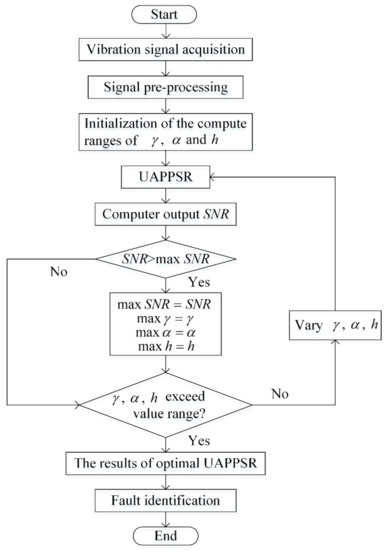 where denotes the length of the input signal, and and are the power of the signal to be detected and the total noise power in the output signal power spectrum, respectively. Therefore, the specific steps of the weak signal detection method based on UAPPSR are shown in Figure 3.