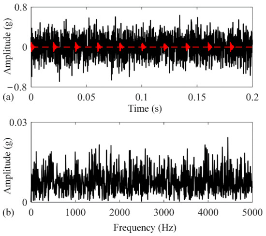 where is the amplitude; Hz represents the modulation frequency; is the attenuation rate; Hz is the sampling frequency; is the noise intensity; represents the impulses that occur periodically; is the interval between the occurrence of the impulse; is the signal length; and is the additive Gaussian white noise for which the mean and variance are 0 and 1, respectively.