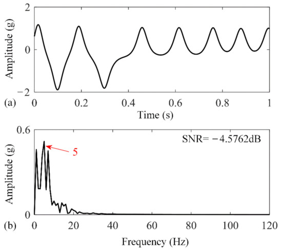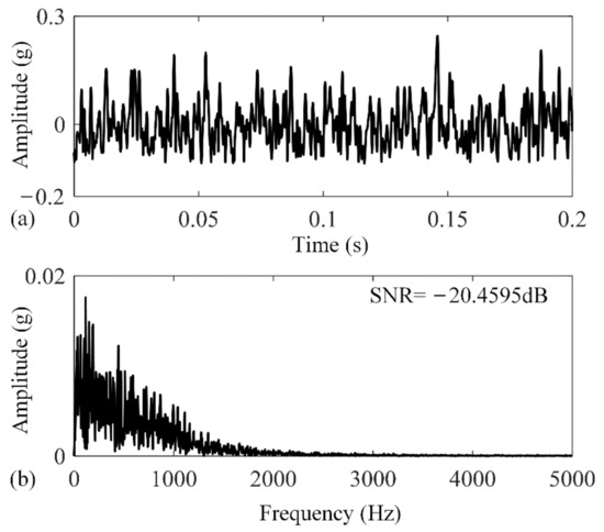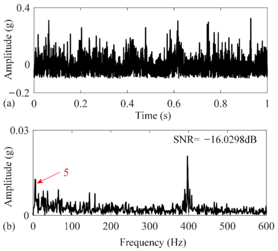 For the gear crack damage signal, the time domain waveform of the original signal and its frequency spectrum are shown in Figure 12. Due to the interference of the strong background noise, the periodic impact signal cannot be directly identified from the time domain. Moreover, the information related to the gear crack failure cannot be found in the frequency spectrum. Therefore, it is difficult to judge whether the gear has a crack fault using only the time domain vibration measurements or the Fourier spectrum. Subsequently, the envelope analysis method is used to process the collected vibration signal, and the results are displayed in Figure 13. Although the fault characteristic frequency of 5 Hz can be observed in the envelope spectrum, the corresponding amplitude is small, and there are many interference frequency components, especially in the high frequency range, which could lead to a misdiagnosis. To further enhance the diagnosis accuracy, the envelope signals of the vibration measurements are obtained and further processed using both the UBSR and UAPPSR methods. The results are shown in Figure 14 and Figure 15, respectively. The results show that both methods can successfully extract the fault feature from the vibration measurements under a strong background noise, but the time domain waveform shows obvious irregularity after the envelope signal passed through the UBSR system. Meanwhile, from the output spectrum, it is found that most interference components in the high-frequency range have been filtered out, while some low-frequency components still exist around the fault characteristic frequency. However, when the envelope signal is analyzed in the UAPPSR system, the high and low frequency noise interference in the output spectrum of the system is eliminated, and the time domain waveform shows good periodicity. By quantitatively analyzing the output SNR of the two systems, it can be found that the UAPPSR system has a higher SNR output than the UBSR system. These results indicate the UAPPSR method can effectively enhance the weak fault characteristic, but it also has better visibility and a higher SNR for the system output.
