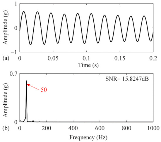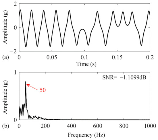 Figure 4a shows the time domain waveform of the simulated signal. It can be seen from Figure 4a that we cannot determine the periodic impact signal component related to the local fault of the gear. The simulated signal spectrum obtained by FFT transformation is shown in Figure 4b. Due to interference from strong background noise, the characteristic frequency component of 50 Hz is completely submerged in the noise, and the fault information of the simulated signal cannot be identified. As the simulation signal containing local gear damage is modulated, the fault characteristic information can be detected with the help of the Hilbert transform (HT). The time domain waveform and its spectrum of the envelope signal (obtained using HT) are shown in Figure 5a,b. In the envelope spectrum, the fault characteristic frequency is still difficult to identify from the surrounding interference frequencies. To further detect the weak fault that is hidden in the simulation signal, the envelope signal is sent to the traditional underdamped bistable stochastic resonance (UBSR) system; Figure 6a,b shows the obtained optimal output signal and the spectrum. The corresponding optimal system parameters are = 0.01 and = 0.046. From the output signal spectrum, it is obvious that the characteristic frequency of 50 Hz, interfered with by the strong background noise is extracted, but there is still a small amount of noise interference around it. Finally, the envelope signal is analyzed using the proposed method. By optimizing the system parameters, the optimal output signal and its spectrum can be obtained, as shown in Figure 7a,b. The corresponding optimal system parameters are = 0.01, = 0.91, and = 0.022. The results show that the time domain waveform of the system output signal presents obvious periodic characteristics, and the fault characteristic frequency of 50 Hz is clearly visible in the system output spectrum. In addition, the surrounding interference frequency components have basically been eliminated. Comparing the output results of the two systems, it can be seen that the UAPPSR system can better recover the periodic shock waveform of the simulation signal using the asymmetric structure of its potential well. When dealing with periodic impact signals, the proposed method has certain advantages, and the output SNR is larger, which can provide highly reliable diagnosis results.