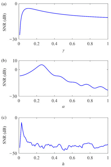 According to the above, to acquire the optimal output of the UAPPSR system, the output signal needs to have an optimal solution with the change of different system parameters. The simulation signal will be used to further analyze the influence of different system parameters on the system output. For the UAPPSR system, we select the same simulation signal as the system input. Among the system parameters, , , and the calculated interval , we changed the third parameter value successively under the condition of fixing two parameters to obtain the changing trend of the system output SNR with each parameter, as shown in Figure 8. It can be seen that the output SNR of the proposed system has similar non-monotonic characteristics to the traditional SR; that is, as the system parameters continue to increase, the output SNR of the system first increases and then gradually decreases after reaching the peak. Moreover, the results show that the maximum SNR of the UAPPSR system output can be obtained by adjusting system parameters , , and the calculated interval to effectively extract the weak fault features under a background of strong noise.