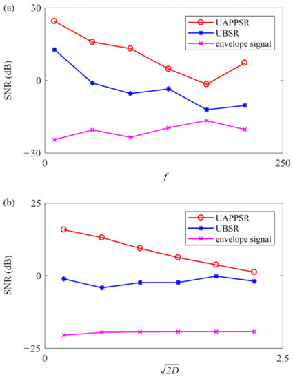 Firstly, the amplitude of the periodic impact signal remains with the noise intensity chosen as , and the other parameters are consistent with the aforementioned simulation signal with local gear damage. The input signal frequency is then gradually increased from 10 to 210 Hz at an interval of 40 Hz. Each driving frequency generates a new simulation signal. The envelope analysis method, the UBSR method, and the UAPPSR method are tested to process the simulation signals, respectively. The optimal output with a maximal SNR under each driving frequency can be obtained. The SNR of each output signal under different driving frequencies is calculated and is shown in Figure 9a. It can be seen that the UBSR and UAPPSR methods can effectively detect input signals under various driving frequencies by adjusting the system parameters and the calculated interval, but the enhancement effect of the UAPPSR method on weak signals is obviously better than the other two traditional weak signal processing methods. The above results show that the proposed method can enhance the detection accuracy of weak fault signals with various input frequencies by adjusting the asymmetric periodic potential structure to a certain extent, which is more suitable for the accurate extraction of periodic impact signals under a strong noise background.