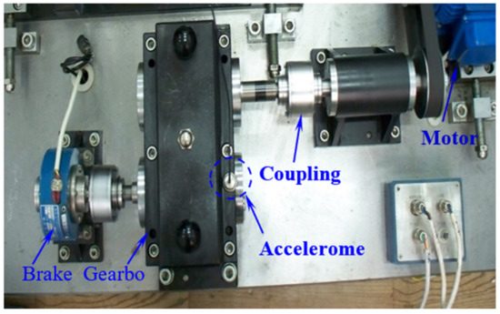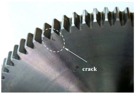 To verify the effectiveness and accuracy of the proposed UAPPSR method in an engineering application, an example gear diagnosis with a local root crack is selected for analysis. In the experiment, the gearbox failure test platform, as shown in Figure 10, is used. The platform is composed of a motor with AC frequency conversion, which is coupled with a shaft, a magnetic powder clutch brake, and a gearbox. Table 1 shows the geometry parameters of the tested gearbox adopted in the experiment. As shown in Figure 11, the normal pinion has 55 teeth, while the tested gear has 75 teeth, on which a root crack is fabricated through wire cutting. The vibration signal is collected by an acceleration sensor mounted on the gearbox housing at a sampling frequency of 12.8 KHz. During the experiment, the rotating speed of the normal pinion is set to be constantly 440.6 r/min, based on which the characteristic frequency of the tested gear is evaluated to be 5.385 Hz.