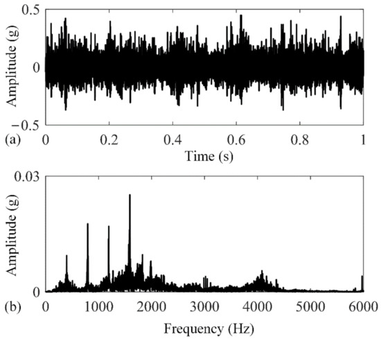 Vibration signal of the tested gear with a local root crack: (a) time domain waveform; (b) frequency spectrum.