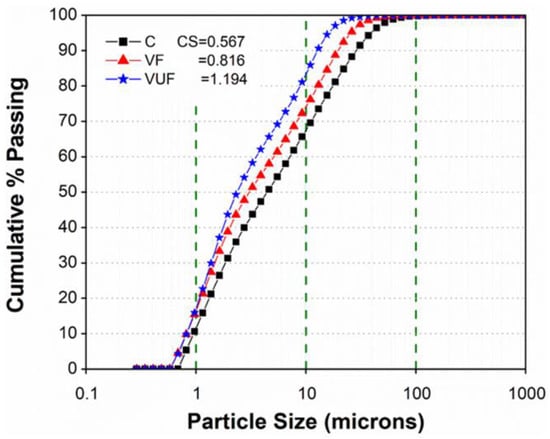 Particle size distribution curves of cement, fine volcanic ash (VF), and ultra-fine volcanic ash (VUF).