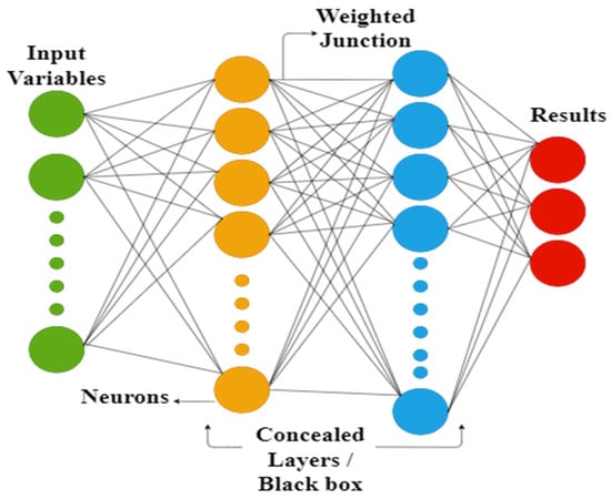 FFNNs use unidirectional connections to create relationships between input parameters and target value [70,71]. The neurons present in various layers are also connected by unidirectional setups. Two types of FFNNs can be used to create predictive models. Single later perceptron is used for linear problems due to its simplicity, and multilayer perceptron is used for nonlinear complex problems due to its ability to efficiently solve complex problems. Here, we employed the multilayer perceptron. Multilayer perceptron consists of inputs, outputs, weights, neurons, mathematical functions, and hidden layers. Inputs are received from the user and transferred to the hidden layers. No computation is performed while transferring data from input to the hidden layers. All processing is performed in hidden layers using mathematical functions and neurons. After processing, the output is presented to the user for further analyses (if required). The whole process is summarized in Figure 2 for a couple of inputs and outputs, three multilayer perceptrons, and three neurons.