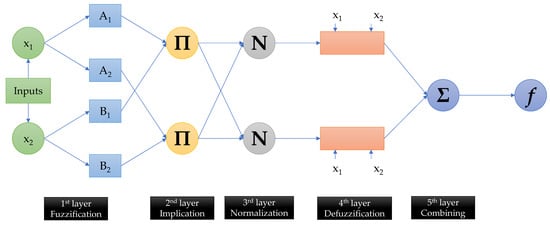 The , , and (‘i’ is 1 or 2) dictate the linear or consequent parameters of the IF-THEN statements, also known as the consequent part. A concise explanation of the five layers as shown in Figure 4 is given below.