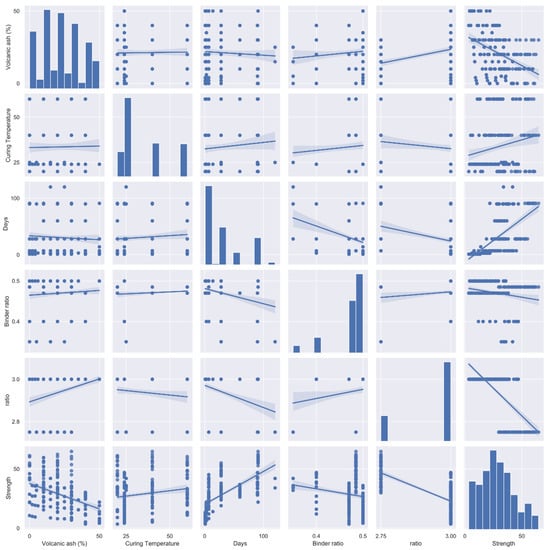 The database representation was performed using Python 3.7. The database consists of four input parameters named VA%, curing temp, age, and binder ratio, whereas compressive strength is the output. All the input parameters selected affect the compressive strength of the mortar directly. The complete dataset was divided into three sets; 70% was utilized to train the model, 15% to test the data, and 15% to validate the model. This distribution can be changed in different studies; however, it is recommended by numerous researchers. The maximum and minimum values for all parameters (input and output) and some statistical indicators are shown in Table 6. The correlation of input variables to the output variable, optimal dosage, and effect of all variables were calculated using built-in libraries of Python 3.7. The details are shown in Figure 5. It is well-known that the variables in a model have a significant impact on its performance. Deep learning is a method used in a neuron-based artificial intelligence approach to estimate material properties depending on the concentration of variables. Python was used to implement a machine learning technique, and the correlation plot was created with the help of the seaborn command. The performance evaluation and accurateness of the model are greatly affected by the selected input variables.
