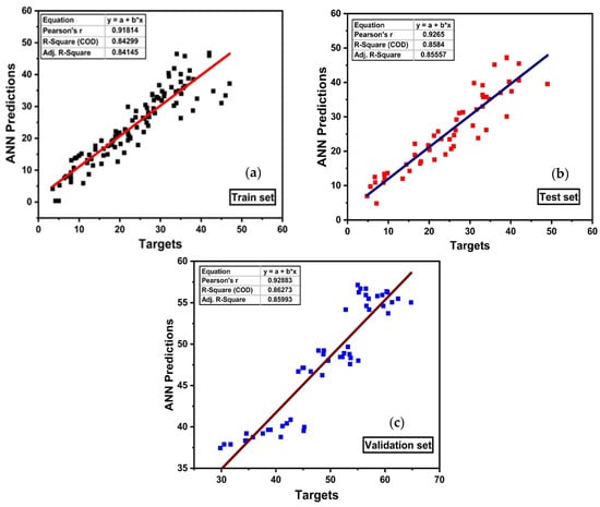 Regression analysis of artificial-neural-network-based predictive model for (a) training, (b) testing, and (c) validation set data.