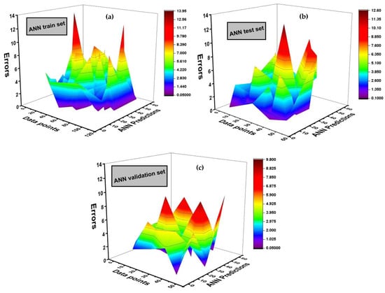 The applicability of the developed ANN model was further evaluated by calculating the error distribution between the predicted and experimental values of training, testing, and validation datasets. Figure 8 shows the error distribution for the training, testing, and validation sets. The dark red shows the higher error values. The error value is low, which implies that the model accurately predicts the compressive strength of VAM.
