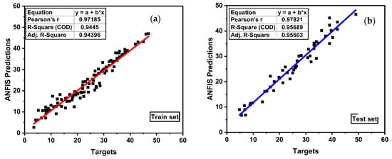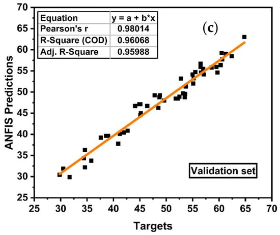 Table 9 presents the detailed statistical analysis and Figure 9 shows the regression analysis of training, testing, and validation set data of the ANFIS proposed model. The location of the points in the figures gives an idea to estimate the R-square. For the best model, the points will be nearer to the regression line. As shown in the figure, all the points in each stage are located nearer to the line. In all three stages, the R-square is greater than 0.9, i.e., 0.94, 0.95, and 0.96, for training, testing and validation sets. In addition, the error values are very low in comparison with the ANFIS predictive model. The MAE, RMSE, RRMSE, RSE, and ρ for the training set are 1.82, 2.51, 0.01, 0.058, and 0.05, respectively. Like ANN, for ANFIS the MAE values in each stage are lower than RMSE, depicting on the lower percentage of higher error values. Consequently, the RRMSEs for training, testing and validation sets are 0.01, 0.009, and 0.004, respectively, which are lower than 10% [85,86]. In addition, the performance index is nearer to 0, i.e., 0.05 and 0.2 for training/testing and validation sets, respectively. Comparatively, the ANFIS outperforms and gives an excellent prediction of the compressive strength of VAM.
