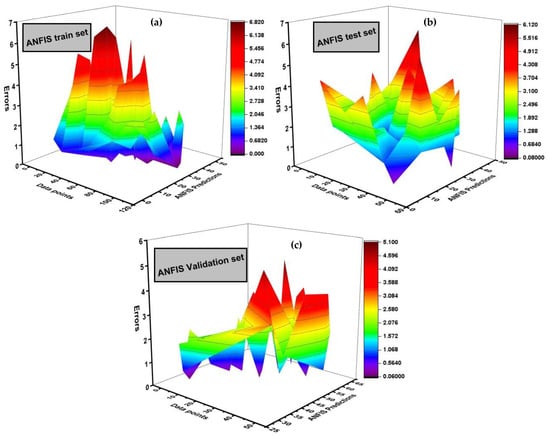 For further assessment of the performance of the ANFIS predictive model, the predicted and error values of every data point are presented on the heat map in Figure 10, which shows the range of errors between experimental values and ANFIS predicted results in the form of different colors. The lower error values are less in each data set, which shows the accurateness of the ANFIS predictive model.