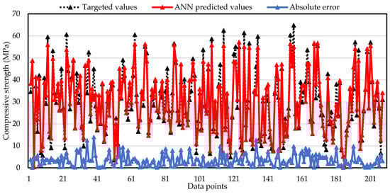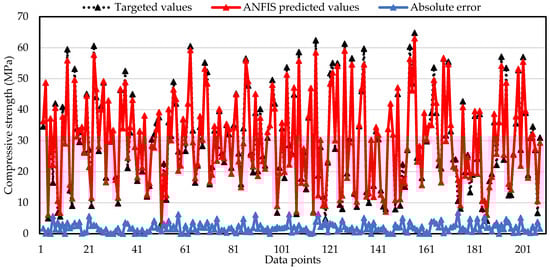 Each neural network (ANN and ANFIS) outperforms on the data provided for compressive strength results of VAM having four input variables. For comparing the performance of each predictive model, the targeted and predicted results along with the absolute error for every single data point are presented in Figure 11 and Figure 12. It can be seen that the absolute error of both prediction techniques runs near the x-axis, showing the accurate prediction of compressive strength of VAM. However, the maximum absolute errors for ANN and ANFIS models are 13.94 MPa and 6.89 MPa, respectively. The maximum error in ANFIS is below 10 MPa. The ANFIS predictions nearly follow their targeted values, giving an outburst estimation of the compressive strength of VAM. Based on RRMSE and performance index, the ANFIS model gives 41% and 50%, respectively, providing a better prediction than the ANN predictive model. The leading performance of ANFIS is attributable to its integrated algorithmic structure of ANN and a fuzzy logic technique.