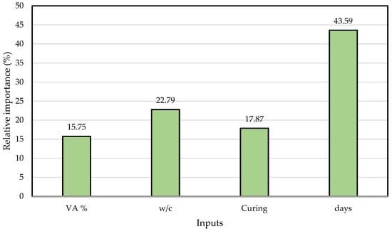 To further verify the performance of the developed models, permutation feature analysis (PFA) was conducted to check the most influential input variable affecting the compressive strength of VAM [1,3,5]. For performing PFA, the extension from the Python programming software was used. As shown in Figure 13, the effect of each input on the compressive strength of VAM is prominent. The most important factor affecting the compressive strength of VAM is the age of curing (43.59%), followed by water-to-cement ratio (22.79%), curing temperature (17.87%), and volcanic ash percentage (15.75%).