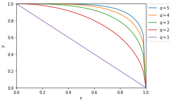 The relation is satisfied by the pairs on or below the line that lies in the first quadrant, so that an fails when , provided . This restriction confines the choice of and to create a triangular region. Yager [16] initiated the thought of the Pythagorean fuzzy set () within which (MD) and (NMD) satisfy the relation . Yager [17] presented the concept of q-rung orthopair fuzzy sets (), considered an efficient method to explain the vagueness of multi-criteria decision-making (MCDM) problems. The s are characterized by a pair of degrees—membership degree (MD) and non-membership degree (NMD)—where the MD and NMD satisfy the relation , for . As an example, is an intuitionistic membership degree (IMD) since . If NMD is 0.6, then due to ; that is, is not an IMD, but may be a Pythagorean membership degree (PMD). However, if the NMD is 0.9, then this situation cannot be described by using neither nor . Since and , so could be a q-rung orthopair membership degree (q-ROMD) and, thus, it is suitable to use the to resolve DMPs. It is clear that, for , it is an IMD, and it is a PMD if , thus, s generalize the s and s. It is worth noting that s express a wider range of handling the information. Therefore, we can still adjust the parameter q to work out the knowledge expression range, and so the s are more suitable and flexible for the uncertain environment.