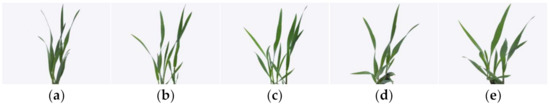 Partial angle pictures of the tillering period. The names of the pictures from (a–e) are LT54-34-1.jpg, LT54-34-5.jpg, LT54-34-10.jpg, LT54-34-15.jpg, and LT54-34-20.jpg.