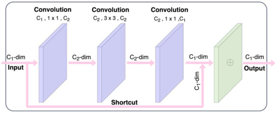 Convolutional neural networks are an important part of image recognition in deep learning [14]. The convolutional layer is the core of a convolutional neural network that extracts image features [15]. A convolutional layer with superior performance can greatly improve the effect of a model. In theory, more features can be extracted by increasing the number of convolutional layers in a model. However, in practice, as the network depth increases, issues such as the vanishing gradient, exploding gradient, and degradation problems will occur [16]. A residual neural network, or ResNet, can effectively reduce the negative impact of these problems. ResNet is a stable and effective DCNN model. The residual structure it introduces can deepen the number of network layers while effectively reducing the impact of problems such as the vanishing gradient and enhance the relationship between the feature maps generated by different convolutional layers, thereby improving the recognition rate of a model. Figure 3 features the residual structure diagram of ResNet-50, which is mainly composed of two 1 × 1 convolutional layers used to adjust the number of feature map channels and a 3 × 3 convolutional layer used to extract features, as well as a shortcut structure and one feature map additive structure. These parts extract the characteristics of the input data, and at the same time make the input data propagate forward faster through a shortcut structure.