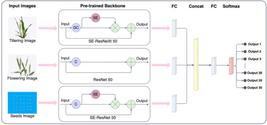 Through continuous experiments, which comprehensively assessed the model training time, model recognition accuracy, and model parameters, different network models were used to extract image features of different wheat growth periods. The tillering stages of different varieties of wheat were relatively similar, especially the seed pictures; the characteristics were difficult to extract. Therefore, the SE-ResNeXt-50 and SE-ResNet-50 models with the SE module and the group convolution module and only the SE module were used, respectively. Although these two models have slightly more trainable parameters compared to the ResNet model, and occupy more system resources, the SE module can adaptively correct the attention of the features, the calculation amount and scale are relatively small, the group convolution for different groups in the module can learn more and different feature representations, and, compared with ordinary convolution, the number of trainable parameters is slightly reduced; through these attributes, the model gained stronger characterization capabilities. Based on the theoretical analysis and experimental results, the SE-ResNeXt-50 and SE-ResNet-50 models were finally selected to extract the features of the wheat tillering stage and seed image data. The characteristics of different varieties of wheat are the most obvious in the flowering period, so the ResNet-50 model, with a low parameter quantity and low system resource occupation, was selected as the backbone. Before the model started training, the parameters obtained after each sub-model training process on the ImageNet dataset were reloaded into each sub-model, and the 1000-dimensional, fully connected layer and its softmax function were replaced [26] so that each sub-model finally passed with a 30-dimensional, fully connected layer. After each fully connected layer, the concat layer was used [27] to connect the three 30-dimensional fully connected layers end-to-end to obtain a 90-dimensional tensor, and then a layer of 30-dimensional, fully connected layers was connected. Finally, the softmax function was used to perform classification and to obtain the final classification result.