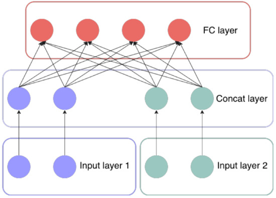 The concat layer structure featured in Figure 7 shows the end-to-end connection process of two two-dimensional tensors. In order to connect the two-dimensional tensors of the two input ends with the fully connected layer of the latter layer, the two-dimensional tensors of the two inputs were connected through the concat layer in the direction of the spliced four-dimensional layer. The tensor was connected to the four-dimensional, fully connected layer of the latter layer, and the activation function was not used in the process of splicing and connecting with the fully connected layer. In this way, the outputs of the three sub-models were spliced together to prepare for the final classification result.