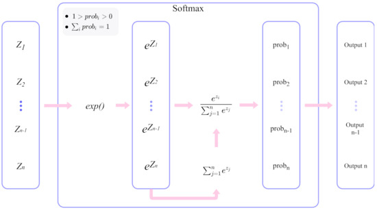 Figure 8 shows the softmax function of the last fully connected layer of the model, through which the model classification results can be output in a probabilistic manner. The softmax function is used for multi-classification tasks. It can map the output of multiple neurons in the model to the 0 to 1 interval, and assign a probability value to the result of each output classification, indicating the possibility of it belonging to each category, thereby completing the multi-classification task. Formula (2) is the expression of the softmax function, where zi is the output value of the i-th node, and n is the number of output nodes. After calculation by the softmax function, the output of the model can be transformed into a probability distribution, and the probabilities of all nodes will add up to 1.