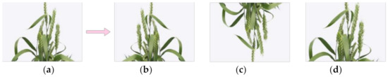 To ensure the stability of the model during operation, reduce the model’s dependence on some irrelevant features, and improve the generalization ability of the model, data processing was required. In the original image, the storage space of a single image at either the tillering or flowering stages of wheat was about 600 KB, and the storage space of a single seed image was about 4 MB. Enhancing the image while ensuring the data feature information is retained can also increase the amount of training data. Figure 9 illustrates several data enhancement methods. The image was flipped horizontally and vertically through horizontal and vertical flip operations. Cropping was conducted to cut an image arbitrarily according to the ratio of 0.8–1.0 of the original image, and the size of the original image was upsampled. Among them, the image horizontal flip, vertical flip, 0.8–1.0 crop ratio selection, and image crop position all adopted the random mode triggered by probability. Finally, the image was scaled to the specified size for network loading.
