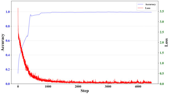 Figure 10 shows the loss and accuracy of the model training process as the number of training iterations increased. As the number of training iterations increased, the training loss rate showed a downward trend. Although the loss rate in part of the training phase did not decrease but rather increased, the overall loss rate was in a declining state and quickly converged, and finally oscillated at around 0.08 without decreasing. Furthermore, as the number of training iterations increased, the training accuracy rate also increased. When the number of iterations reached about 1100, the model was very close to the local optimal solution in the solution space, and the training accuracy also tended to converge. Since the PiecewiseDecay learning rate was used, each piecewise learning rate could allow the optimization to proceed to a state where the weight vector distribution was relatively stable, in order to obtain a better local minimum. It can be seen from Figure 10 that the training accuracy curve dropped several times during the rising process, but the model finally deepened the learning of the data, overcame the trap of local optimization, further improved the wheat identification accuracy, and finally stabilized. It can be seen that the model continuously adjusted the parameters, and the learning effect was continuously improved.