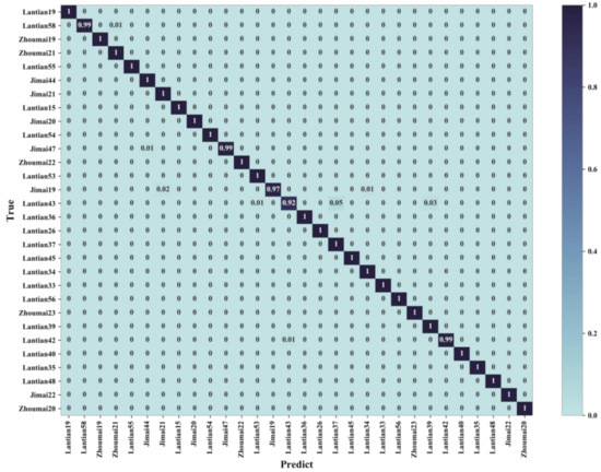 To further verify the model, the generalization ability and robustness of the model was tested. The test dataset was used to test the trained model, and a confusion matrix [30] was used to visualize the model test results. Figure 11 shows the classification confusion matrix for the 30 wheat varieties. In the confusion matrix, the horizontal axis represents the prediction results of the model, the vertical axis represents the true category of wheat varieties, the elements on the main diagonal represent the percentage of correct model recognition, and the remaining positions represent the percentage of model recognition errors. It can be seen from the figure that the recognition rates of Lantian58, Jimai47, Jimai19, Lantian43, and Lantian42 were all lower than the overall level. Among them, the recognition accuracy of Lantian43 was the worst, only 91.9192%. By analyzing the confusion matrix, we knew that Lantian43 was most likely to be misclassified as Lantian37. In the testing process of the remaining 25 varieties, the model successfully predicted almost all test samples, with an accuracy rate of about 100%, for Lantian45, Jimai20, ZhouMai21, and so on.