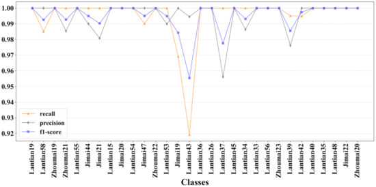 As shown in Figure 12, combining the above confusion matrix and the model classification evaluation indicators, the precision, recall, and F1-score of the model on the test dataset can be calculated, respectively. When only considering the precision rate, the model had the worst recognition ability for Lantian43, followed by Jimai19; Lantian45, Jimai20, and Zhoumai21 had the best recognition results. If the precision rate and the recall rate are considered comprehensively, and the precision rate and the recall rate are equally important, (); that is, in the case of the F1-score, the model’s ability to recognize Lantian43 was also the worst. The second worst was Lantian37, indicating that the model needs to improve the extraction of Lantian43 features.